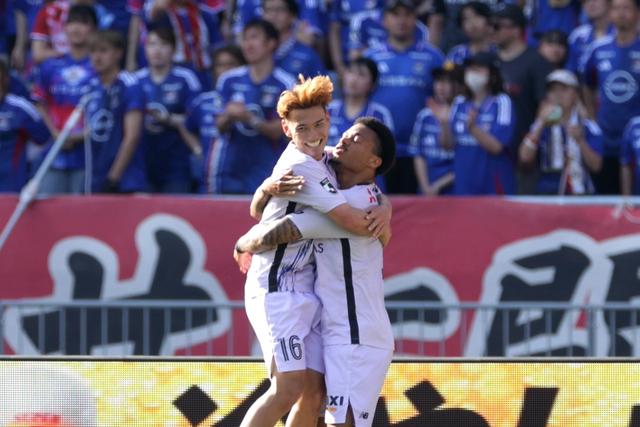 上写真=アシストのマルセロ・ヒアンとゴールを喜ぶ。佐藤恵允のランの質の成長が頼もしい(写真◎J.LEAGUE)